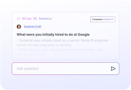 Atlas ingests interviews, intake meetings, notes, emails, phone calls and can deliver a first draft candidate report in seconds