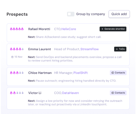 Not all activity is progress. BD assistant reads between the lines of your candidate and client interactions to identify momentum. Or lack of it. It flags the deals that are moving, stalls that need re-engagement, and patterns that signal likely drop-off. With clear visibility into what’s working, your team knows exactly where to act next.