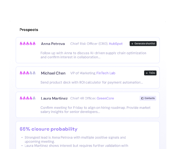 Atlas analyses, ranks, and scores every opportunity in your pipeline in real time. It scores interest, momentum, and potential, all paired with a probable likelihood of converting.