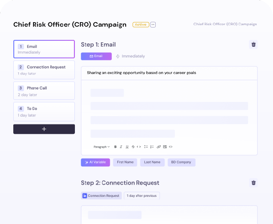 Run tailored campaigns across email, social platforms, phone calls, and more for each senior candidate. Shape each campaign with agentic AI that reads your notes and writes targeted messages for you.