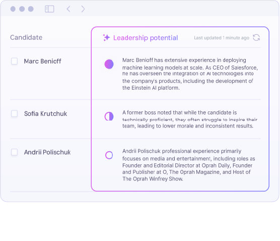 Magic Columns follows your instructions to rank candidates based on the criteria that matter to you and your client. It scales your thinking and keeps every shortlist sharp, defensible, and aligned with the leadership profiles that drive project and business success.