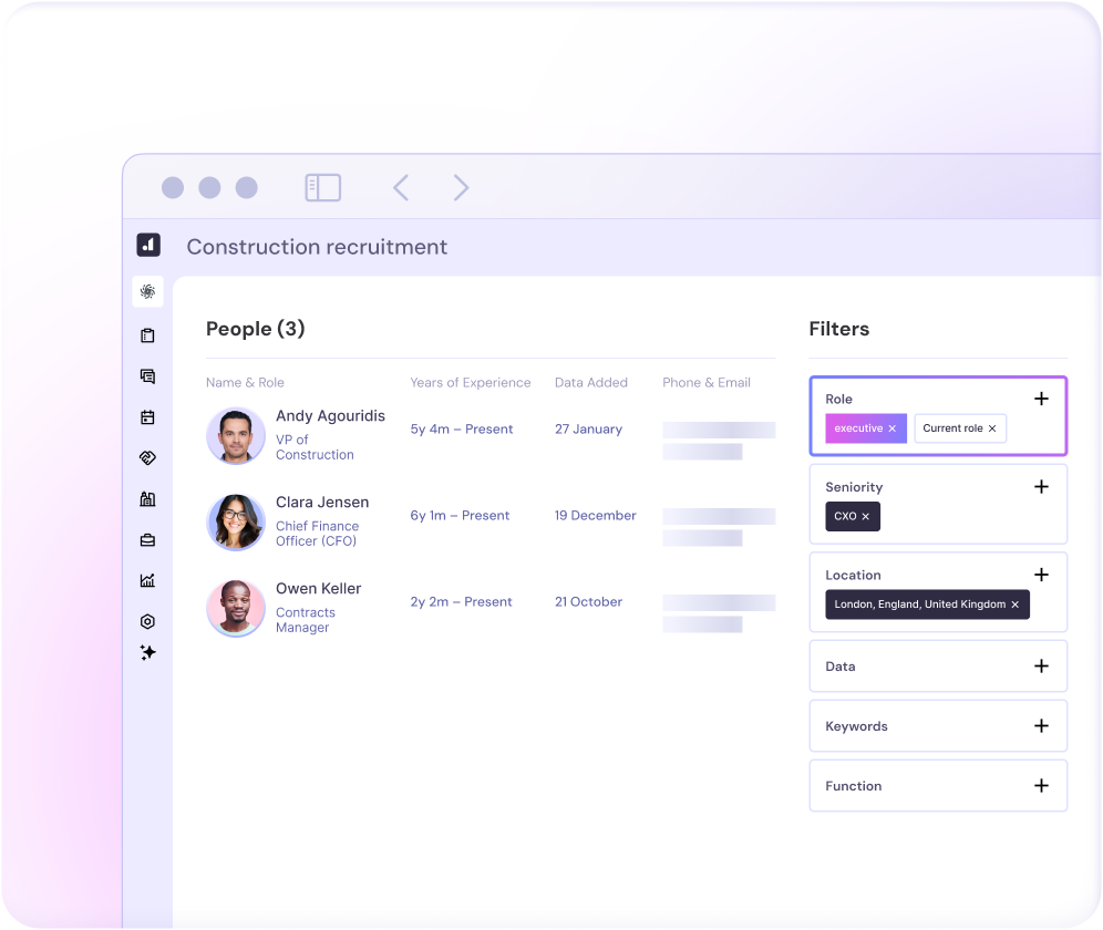 Reach every construction executive candidate with personalised outreach designed to help you assess leadership fit and streamline your search process.