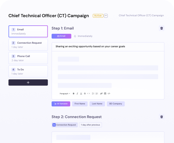 Leave no executive candidate behind with personalised outreach built to help you assess candidates and streamline your recruitment process. Launch and manage tailored campaigns with emails, social media outreach, phone calls, and more for each candidate, bypassing most of the hiring challenges associated with manual outreach.