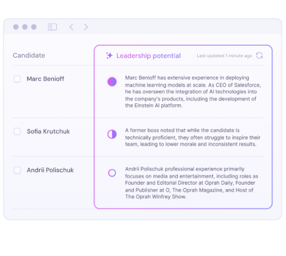 Generic scoring tools miss the nuance required to evaluate senior leaders with accuracy. Magic Columns follows your criteria with precision, ranking candidates based on the leadership attributes, achievements, and behavioural markers that matter most to you and your client.