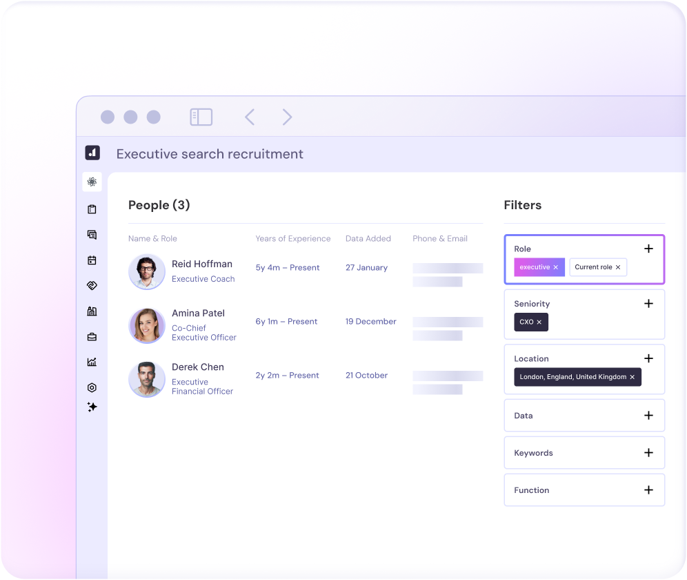 Log recruitment cycles, passive candidates, and clients looking for quick results from your hiring processes. Sourcing top candidates and landing high-quality executive placements can now take executive search specialists weeks instead of months of back-and-forth.