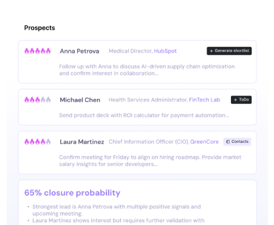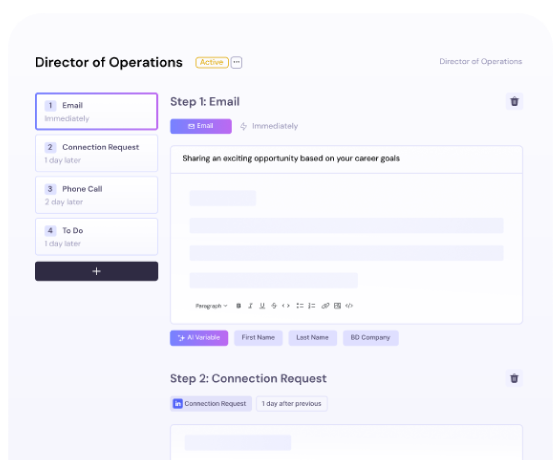 Run tailored campaigns across email, social platforms, phone calls, and more for each candidate, whether they are clinical specialists or scientific leaders. Shape each campaign with agentic AI that reads your notes and writes targeted, role-specific messages, helping you stand out in a competitive market.