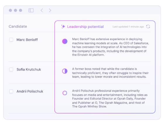 Magic Columns interprets your criteria and applies them consistently, ranking candidates based on the competencies that matter the most to your clients.