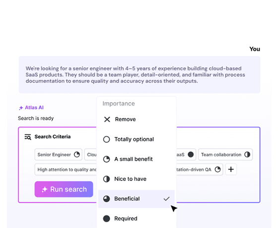 Behind the scenes, Atlas uses generative AI to interpret intent, nuance, and priorities. That means you spend less time constructing searches and more time reviewing candidates who genuinely fit what you asked for.