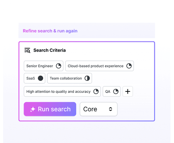 Hiring criteria evolve as you learn more, and Magic Search is built for that reality. After your initial results, you can quickly adjust the search criteria, change priorities, or refine expectations without rewriting the entire request.
