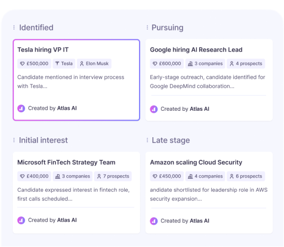Atlas names and contextually renames your opportunities based on the prospects and companies added to your campaigns. Its intuitive Kanban board understands which stage each opportunity belongs to, freeing you from time-consuming busywork.