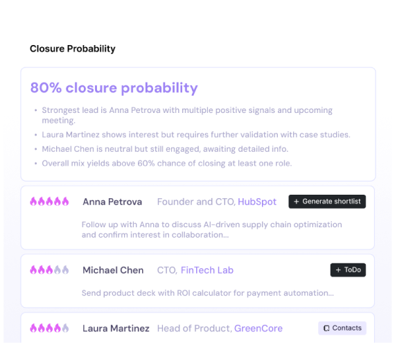 Atlas analyses, ranks, and scores every opportunity in real time to score interest, momentum, and potential, all paired with a probable likelihood of converting. Prioritise the most promising deals and stop wasting time on cold, disengaged leads.