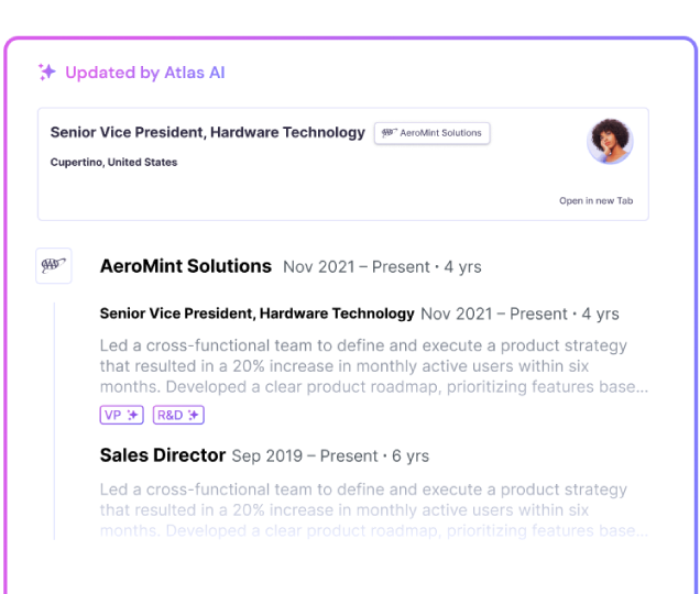 Manually tracking job changes is slow, repetitive, and easy to get wrong. Atlas takes this task off your plate entirely, monitoring thousands of contacts and updating your database without you lifting a finger. It saves your team hours each week while improving data quality and surfacing new opportunities faster.