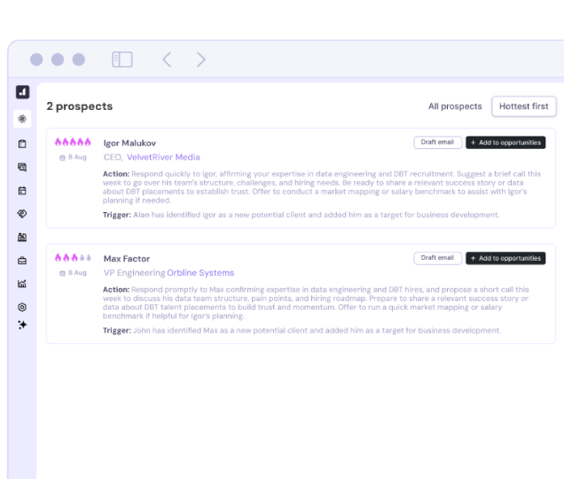 Atlas monitors your network in real time and alerts you when someone changes roles or companies. Whether it’s a candidate you placed two years ago or a long-lost prospect, you’ll get a notification the moment their job title or company updates. No more stale data, no more missed signals, only timely insights you can act on.