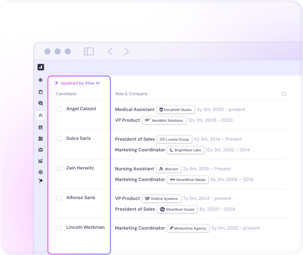 Atlas tracks role and company changes across your network in real time with agentic AI, updating all candidate records.