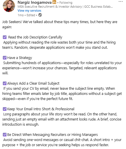 Nargiz, in this post, highlights that the job description should always be read carefully, because applying without understanding the role wastes both the candidate’s time and the hiring team’s time.