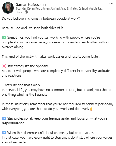 Samar points out that in all cases, professionalism is key. She touches on a difficult but very real topic: not every collaboration will feel comfortable, even though all employees naturally wish for positive teamwork and good chemistry.