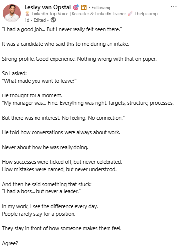 The environment matters just as much. This is what Lesley highlights. People leave when the connection is missing.