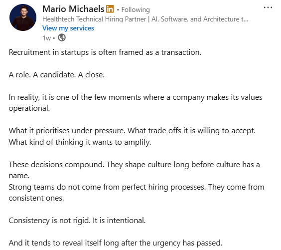 Mario explains that recruitment in startups is often seen as a transaction, but it reflects much more. It shows a company’s values in action and how it makes decisions under pressure.