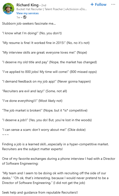 Beneath the humour is a strong message: finding a job is a skill, and recruiters are the experts in that process. Richard’s post reinforces that idea by sharing a personal anecdote that adds credibility and personality. It works because it balances entertainment with authority, leaving both candidates and recruiters nodding in recognition.