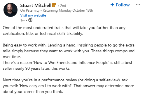 Stuart brings the focus back to something simple yet often overlooked: likability. In a field that prizes performance metrics and targets, his post cuts through by reminding recruiters that relationships still drive success.