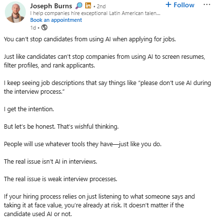 Joseph points out that candidates should be free to use whatever tools they want, and we can’t realistically force them not to use AI. His main message is that companies should focus on making interview processes more efficient: be more curious about candidates’ profiles, ask deeper questions, and don’t just accept what someone says at face value; investigate further.