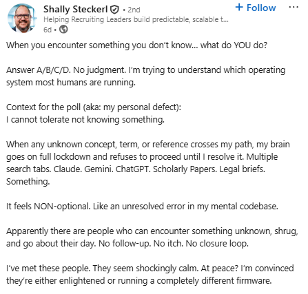 Shally shared a poll asking, “When you encounter something you don’t know… what do you do?” The four options were to look it up immediately, look it up later, not be bothered by not knowing, or assume someone else will handle it.