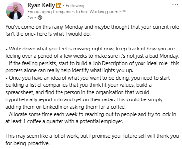 Once you are clear about your values, research companies that align with them. Build a list and track the right contacts. Reach out and start conversations, even informal ones.
