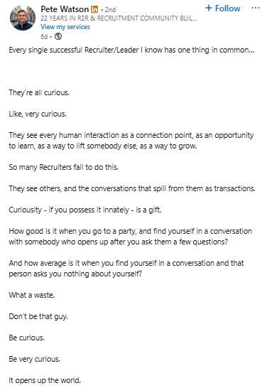 Pete’s post highlights a key truth in recruitment. In most roles, there are many recruiters involved. The ones who succeed all share one thing – curiosity. That is what Pete is showing.