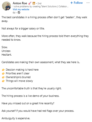 The best candidates understand a company through the hiring process. They use it to assess the culture and how the business operates. When the process feels slow, unclear, or hesitant, they notice it quickly. Many will choose to walk away.