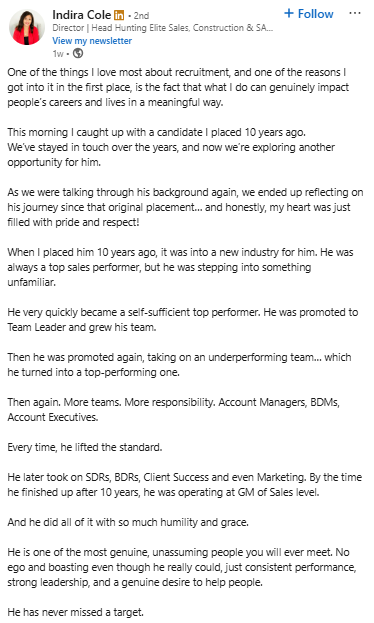 Recruitment is about building long-term success stories. This post feels like Indira sharing her story. It shows how one placement can grow over time. The candidate moved into a new industry and kept progressing step by step.
