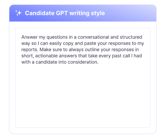 Atlas lets you define how it should write, whether you’re crafting candidate profiles, client reports, outreach campaigns, or interview transcripts. Set the tone, structure, and level of formality once, and Atlas applies it consistently across every workflow. The result: less rewriting, more trust, and outputs that sound like you.