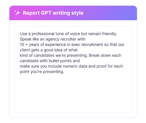 Candidate profiles are often shared directly with clients, so they need to reflect your standards. With writing styles in Atlas, you can control how profiles are structured and how they sound, bullet points or prose, formal or informal, detailed or concise. You set the tone, and Atlas generates write-ups that are aligned with how you’d present someone in a real shortlist.
